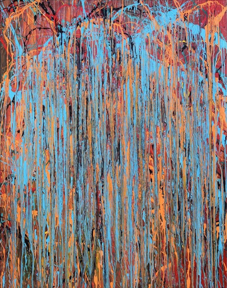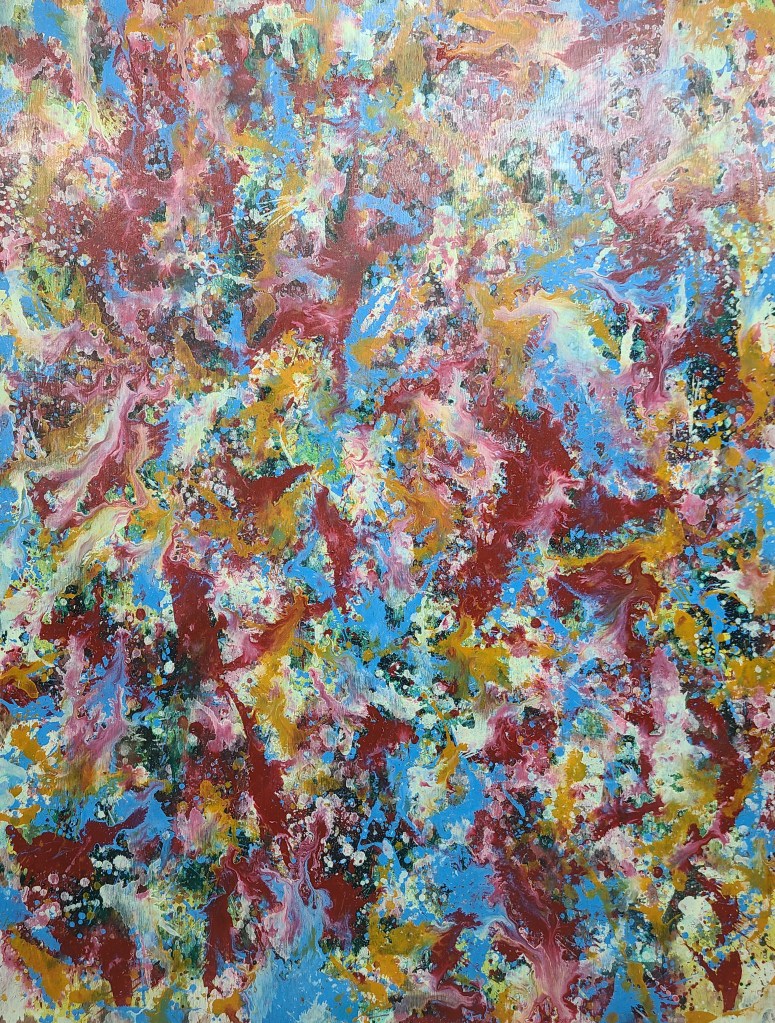 Paint is poured in the air to form shapes, and the three colors, not yet dried, spread under the influence of gravity. In this process, colors overlap and mix, creating unique patterns that are unexpected. It presents a visual shock and reveals an improvised presence, prompting the viewer to enter a state of contemplation.