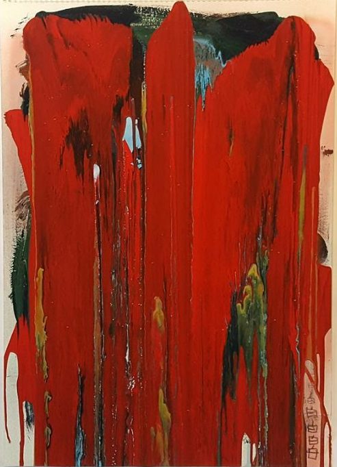 The balance of paint’s flow and form, as well as the mixture of colors, is observed. The movement, which began without purpose, gradually falters and transfers paint onto the canvas. In the process of the brush moving the paint to the canvas, unintentional shapes are created and distorted by gravity. Initially, the upright canvas tilts, reducing the influence of gravity and acknowledging changes in form. The colors reflect the inner sensations and the surrounding environment. This work is recorded, considering the meaning of the layers of paint that have been applied. It is a work from 2017.